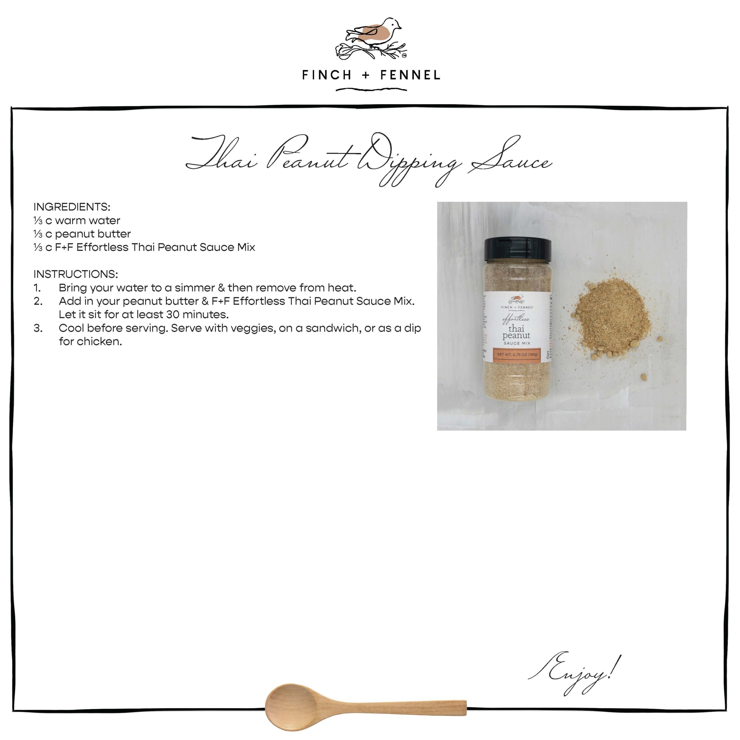 Simply blend F+F Effortless Thai Peanut Sauce Mix with warm water and your favorite peanut butter (nutty or creamy!) to create a rich, full-flavored dipping sauce perfect for fresh or fried spring rolls, grilled meats, and much more.